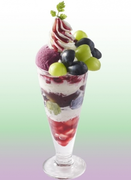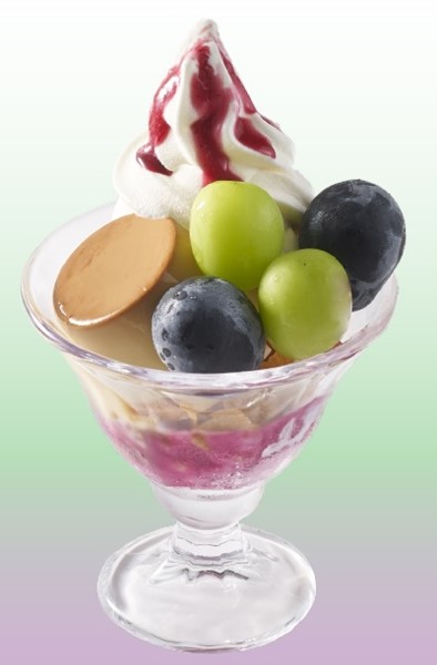大粒ぶどうがごろごろ入った人気のパフェは、アロエ・ぶどうゼリー・ソフトクリーム・ぶどうソルベなど、様々な味わいが何層にも重なっているため、最後まで飽きることなく楽しめるという。