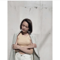 バニラカラーのノースリーブは上品な色合い。オーソドックスなラウンドネックですっきりとした印象に。更にへそ出しでヘルシーに肌見せをしている。