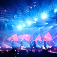 「HERE WE GO」では巨大な旗を掲げたフラッグ隊が登場。そこに本物の炎と、巨大なバックスクリーンに映し出されるグラフィックが合わさる。旗が左右にたなびく動きと、ステップが左右に動くダンスがシンクロし、現実と映像の境目がなくなるような感覚に陥る見事な演出であった。