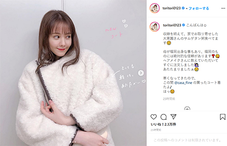 「可愛い」と反響の“モコモコ”トリンドル玲奈(Instagramより@toritori0123)
