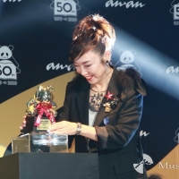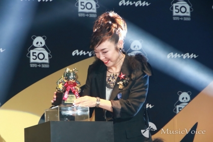 ananのマスコットのアンアンパンダにちなんだ“金のパンダ”が贈呈された松任谷は、「愛らしいです。この先なにか成功することがあったらマーカーで(目の周りを)こう…それじゃダルマじゃないですか(笑)」と冗談交じりに喜びを示した。