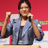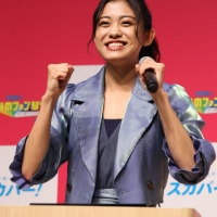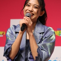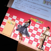 鉄道番組をプレゼンしたBEYOOOOONDSの一岡伶奈=記事は別掲=の後に登壇したつばきファクトリーの岸本ゆめのは『スペシャルまつりsupported by スカパー!つばきファクトリー×STU48生中継』をプレゼンした。