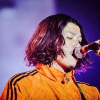 ノイジーなSEとともにステージ前方の幕が開き、メンバーが姿を現すと、ドープな雰囲気の「脱衣麻雀」でライブがスタート。AAAMYYYはフードの上からヴェールを被って顔を隠し、John Natsukiは坊主頭にサングラスという風貌で、曲調も含めミステリアスな雰囲気を放つ。しかし、後半から一転してファンキーなリズムに変わると、フロアの空気も変わり、小原綾斗の骨太なギターリフをフィーチャーした「SONIC WAVE」へとなだれ込んでいく。