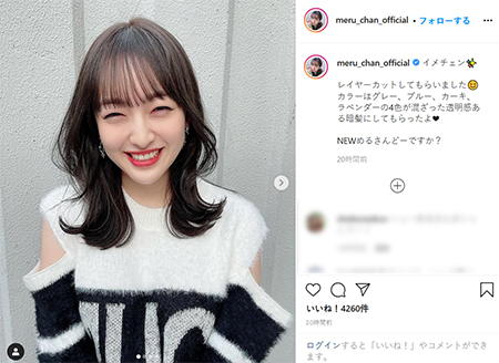 フォトニュース HKT48田島芽瑠、レイヤーカットにイメチェン レイヤーカットにイメチェンしたHKT48田島芽瑠。「可愛い」と好評だ(Instagramより@meru_chan_official) みんなの意見は?コメントを見る 関連写真・動画 この投稿をInstagramで見る 田島芽瑠(@meru_chan_official)がシェアした投稿 写真一覧 みんなのコメント コメントを書く(ユーザー登録不要) この写真の記事を読むHKT48田島芽瑠、レイヤーカットにイメチェン「爆カワ」と好評