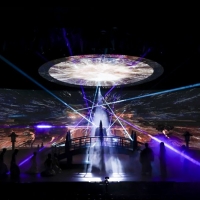 舞台には透過スクリーンが場面ごとに下り、ステージ後ろと天井には巨大スクリーンが配置され、そこに映像が映し出される。映像だけで舞台の背景を映し出すだけでなく、レーザーなどの光の演出も加わり、壮大で幻想的だ。音響も、客席を取り囲むようなサラウンドが構成され、さながらその世界にいるようで、没入感が味わえる。そのなかで演じる大沢たかおはじめとするキャストの力漲る芝居は圧巻だ。