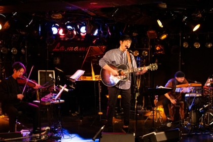 再びステージに戻り、後半は浜端と山本の2人でスタート。大陸的なメロディが胸を打つ「夜曲」は、浜端がプロデューサーである寺岡呼人の存在を知るきっかけになった矢野真紀のカバー曲。ロマンチックなプロポーズを歌った「月の瀬橋」と共にバイオリンの音色が繊細かつ大胆に舞い踊り、浜端の歌心を引き立てる。