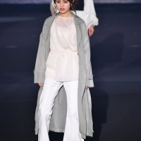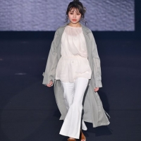 登場したのは、トレンドかつベーシックに着回せることをコンセプトとするブランド「moment+」のステージ。カーキのスプリングコートと、背中が大胆に開いたシフォンブラウスを着こなした。ランウェイでは、その美背中を見せるポージングも。