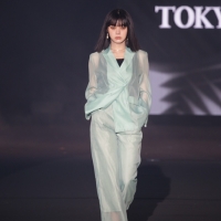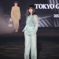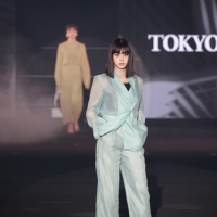 大人のサステナブル・エシカルファッションをテーマにしたブランド「Re:EDIT」のステージに登場した池田。グリーンのジャケットとパンツは、オーガンジー素材で透け感が印象的だ。池田はクールな表情でランウェイを歩き、ブランドの世界観を表現した。