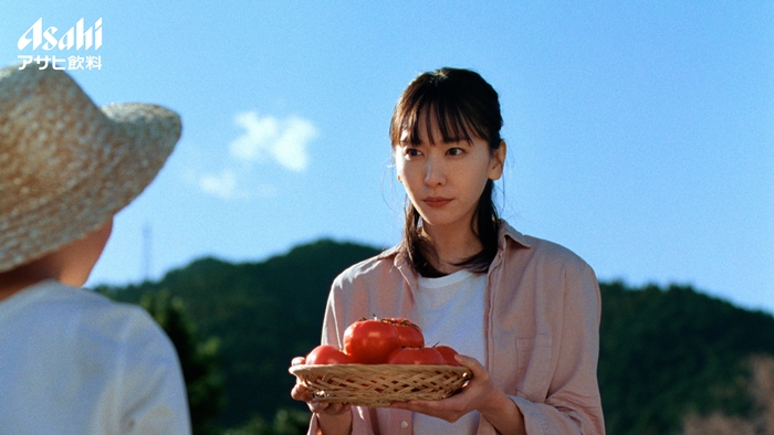 収穫したばかりのみずみずしいトマトと「アサヒ十六茶」を味わう新垣結衣の姿や、おすそ分けでもらったトマトと「アサヒ十六茶」を味わう中村倫也の姿が爽やかに描かれており、新垣、中村、双方のCMを繋げる少年も要チェックだ。