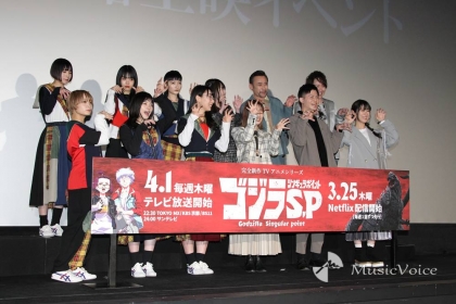声優の宮本侑芽、石毛翔弥、久野美咲、釘宮理恵、高木渉、置鮎龍太郎、そして、BiSHが19日、都内で、アニメ『ゴジラ S.P<シンギュラポイント>』完成披露上映イベント舞台挨拶に臨んだ。オープニングテーマ「in case...」を歌うBiSHは、ゴジラを取り入れた振りを構想中であることを明かした。