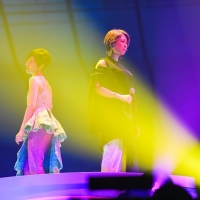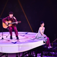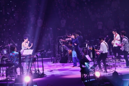 「自分の結婚式でもこんなドレス着てないわよ!」とか「歩くとルンバみたいでしょ?」と笑いながら言っていた豪華な衣装から、いつの間にかピンクのパンツスタイルがキュートな衣装にチェンジしたら、お楽しみのゲストコーナーへ。そう、今回の25周年記念LIVEではリリースしたばかりのアルバム『Duets』で共演したアーティストがゲストでお目見え。まずは内村友美(la la larks)が登場すると、一緒に「色彩」を歌う。言わずもがな「色彩」はla la larksが提供した楽曲なので、ふたりで歌うと更に最強。センターステージの中央部分はせり上がるようになっていて、背中合わせになって歌う姿にはユニット感が漂う。デュエット曲「sync」は難しい旋律をふたりで軽やかに駆け上がる美しさ。MCではふたりで向き合い坂本が「あなた綺麗ね」としみじみ言うと、内村が「そんなディズニープリンセスみたいな真綾さんに言われても!」と返したシーンが面白かった。1日目、2日目の共通ゲストとしてもう一人、とびきりのエンターテイナーぶりを発揮して会場を盛り上げたのがポップの貴公子、堂島孝平。花道の端っこから「真綾さんもうちょっとです〜!」とか言いながら走ったり転んだりしながら登場するだけで何でこんなに面白いのだ、この人は。デュエット曲「あなたじゃなければ」では、喧嘩しながらじゃれあうようなカップルをコミカルに、時にアドリブも交えて披露すると坂本のパフォーマンスもいつも以上にハイテンション。その後で堂島がアコースティックギターを奏でながら、彼が作曲を手がけた「レコード」を一緒に歌う場面も。インタビューでも坂本が堂島のことを「本当に何でもできるんですよ!」と絶賛していたが、それを目の当たりにするような客演だった。