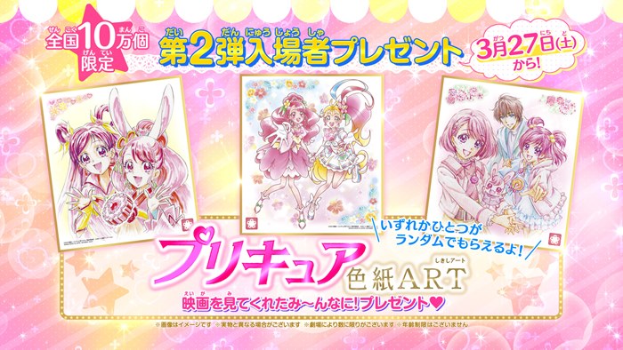全国10万枚限定で鑑賞者全員にランダムで配布される、第2弾入場者プレゼントは豪華3種類の「色紙ART」。1種類目は本作でキャラクターデザイン・総作画監督を務め、TVアニメ「ヒーリングっど(ハートマーク)プリキュア」と「Yes!プリキュア5」の作画監督もつとめた爲我井克美が描き下ろした。2種類目は「プリキュア5」「5GoGo!」でキャラクターデザインを務めた川村敏江が描き、そして3種類目はキュアサマーとキュアグレースが描かれたデザインとなっている。