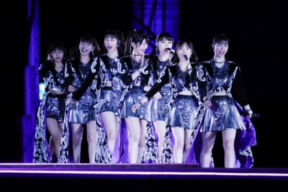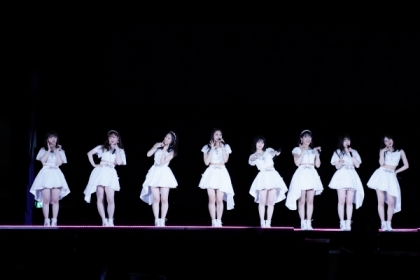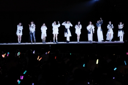 また、終盤のプレミアムパート前にはその回のプレミアム担当グループの曲を他グループが合同でカバーするブロックも。1 曲を2 グループ合同(初日だけ1 グループでのカバー有)でパフォーマンスし、組み合わされるグループも4 公演全てバラバラという贅沢なその回限りの共演が次々と繰り広げられた。観客は全員着席、ソーシャルディスタンスをとりながら鑑賞というスタイルのライブではあったが、その分各グループ、各メンバーがステージで放つエネルギーの大きさと眩さがより際立った公演であったともいえる。360 度に展開された観客席からは声援の代わりにペンライトが振られ、パフォーマンスごとに大きな拍手が贈られた。ラストは幕張メッセの大ステージに全グループが一挙集結。全員でのパフォーマンスで華やかにライブを締めくくった。