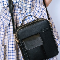 バッグはユニセックスで使えるようにしていて、レザーっぽく見える黒の生地で作ってもらいました。実用的にしたかったので、スマホが入れられるポケットが外側に付いていたり、フックが掛けられるような部分があったり、長財布が縦に入るサイズで作ってもらったりしました。自分は荷物が多いタイプなので、このバッグに全部収納できたらいいなと思って、男性にも女性にも使ってもらいやすいデザインになっています。ステッチも白いラインを入れてもらっているので、かわいいかなと思います。