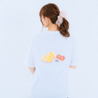 松田 上半身に厚みがないのがコンプレックスなので、Tシャツは体形を隠せるというか、体系感がないようにしたくて、肩を落とした形になっているので、ゆったりしていて男性にも着てもらえるんじゃないかなと思います。後ろのイラストは自分で描きました。夏っぽいパインと(自分の)好きなさくらんぼを描いて、落書きをしている時にかわいい青虫が描けたので、それも添えました(笑)。