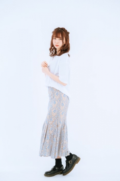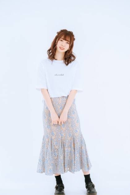 スカートはマーメイドスカートと言って、腰の形が出て裾は広がるみたいな、緩いきれいな形が見えるスカートで、前から好きだったので、せっかくスカートを作れるなら、こだわって作ろうと思って。脚が長く見えるようにタイトなところから裾が広がるところの位置をちょっと高くしたり、Tシャツをインするファッションも好きなので、ウエスト部分が見えてもいいようにゴムじゃなくて、太めの感じにしたり。レースの花柄もかわいくて、色も単色のかわいいレースもいっぱいあったんですけど、夏だからというのを連想して、ちょっとくすんでいるけど明るい水色にベージュっぽい色にしました。女の子には特別な日に履いてほしいなと思います。