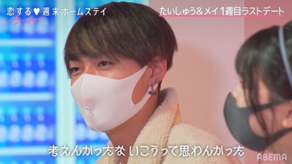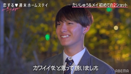 第2話から追加メンバーとして登場した、たいしゅう。自己紹介が終わると、たいしゅうは方言交じりに「カワイイ恋がしたいけ、キュンとできるような、心に刺さるような恋を探しに来た」と言いながら、隣に座っていたメイに2ショットを提案。そして別の場所に移動すると、自分が選ばれたことに困惑するメイが、「年下大丈夫?2コも下だけど…」と心配そうな表情を見せるが、たいしゅうは大丈夫と言うように笑顔で頷く。そんなたいしゅうに対し、メイが「年下と付き合ったことある?」と質問すると、たいしゅうは「年下はない。初めて」と返答。それを聞いたメイは、逆に自分は年上と付き合ったことがないと話し、「年上と付き合ってみたい」と願望を打ち明けた。そんなメイに対して、たいしゅうは「年上の方がいいよ、たぶん…(笑)」とアプローチすると、その後のインタビューで「挨拶の時から『カワイイな…』と思って誘いました。最初は恥ずかしそうだったけど、話してみたらあっちもちょっと楽しそうにしてくれたので良かったです」とコメント。一方メイは、「(たいしゅうが)高3っていうのもあって、2コ上だから大人っぽい感じでした」と好印象を語った。