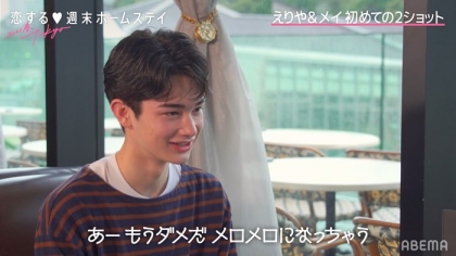 2日目の朝、朝食をとるために原宿のカフェを訪れると、男子メンバーの中で人気No.1のえりやを同い年のメイが2ショットに誘い出しました。そして、2人が会話に花を咲かせていると、突然えりやが「昨日はニヤニヤしすぎて絶対気持ち悪いって思われちゃったから、今日はニヤニヤせず男らしく行こうと思う。カッコよくいきます!」と宣言。しかし、これを聞いたメイに「笑ってた方がいいよ。真顔だったら怖いじゃん!」とアドバイスされると、えりやは「じゃあ真顔よりはニヤニヤしてた方がいいか…。これからもニヤニヤするわ(笑)」と満面の笑みに。