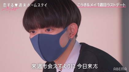 突如、メイの前に登場したこうき。メイが「来てくれないと思ってたから超意外!『え!?』みたいな。マジびっくりした!嬉しいんだけど『何で?何で?』って」と驚きを伝えると、こうきは、気になる相手がメイであることを伝えながら「いろいろ知りたいなっていうのも増えて来たし、だから来週も会えるように今日来た」と明かした。その後、会話をしていくなかで、理想のデートプランやお互いの趣味の話で盛り上がると、その後のインタビューでこうきは「やっと誘えた安心があったんですけど、話してみて映画が好きという一緒の共通点とか、『一緒に映画観たいな』っていう、自分のしたいデートの価値観が合ってすごく嬉しかったです。もっと来週から頑張りたいです」と今後の意気込みを語った。