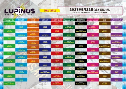 2021年5月22日(土)に下北沢10会場のライブハウスを使用し開催される女性ボーカルアーティスト限定のサーキットイベント”LUPINUS ROCK FESTIVAL”(ルピナスロックフェスティバル)のタイムテーブルが公開された。総勢85組が下北沢に一挙集結し同時多発的にライブを繰り広げる。