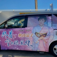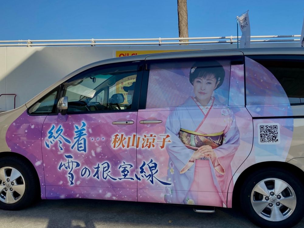 私が運転するようになったのは昨年の3月からなのですが、長年全国を走って来ましたのでエピソードは沢山あります(笑)。サービスエリアで休憩しているとラッピングカーを見た方から声を掛けて頂き、次のサービスエリアまで観光バスに乗って歌わせて頂いた事があります。愛知県の会社のツアーで下呂温泉からの帰りだったと思いますが、皆さんも飲んで歌い疲れているところに“元気印”の私が飛び込んで行ったので、皆さん大喜びで盛り上がって頂きました。CDも沢山買って頂き、ご祝儀やお土産まで頂いて、最後には別のお仕事まで頂くという大変なご縁が出来ました。偶然の出来事だったとはいえ、車移動で全国を回っていたからこその出会いだと、今も強く印象に残っています。