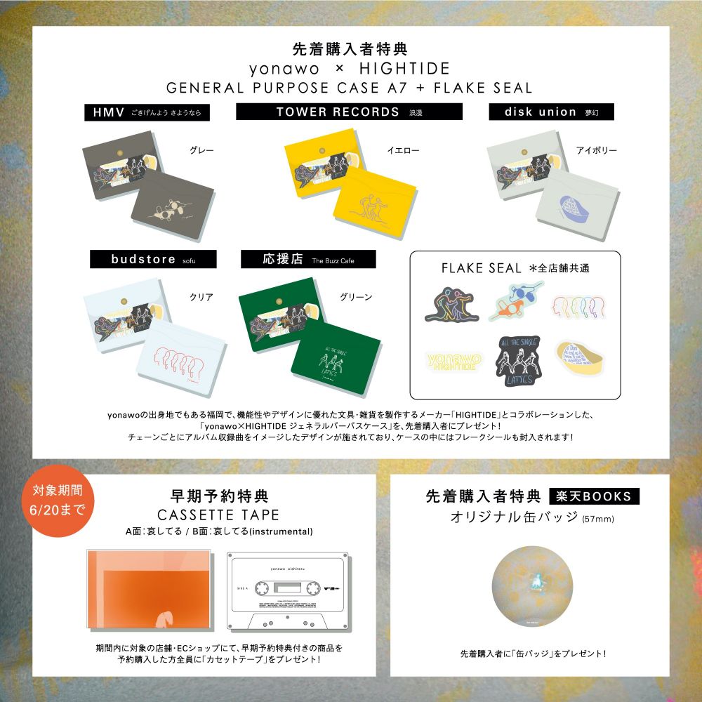 今回はyonawoの出身地でもある福岡で、機能性やデザインに優れた文具・雑貨を製作するメーカー「HIGHTIDE」とコラボレーションした、「yonawo×HIGHTIDE ジェネラルパーパスケース」が付属する。チェーンごとにアルバム収録曲をイメージしたデザインが施されており、ケースの中にはフレークシールも封入される。