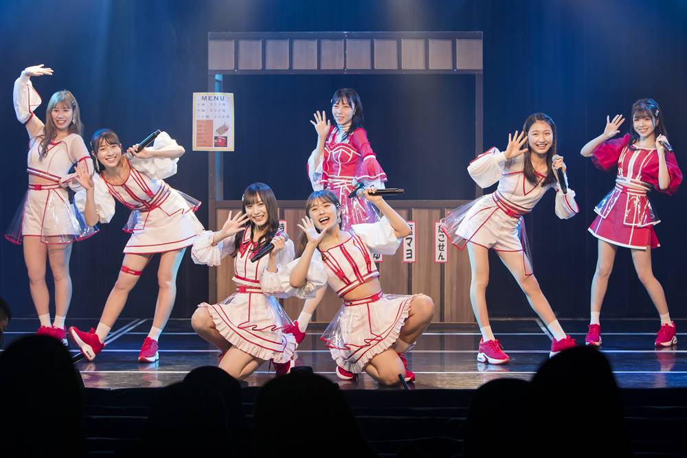 第1部は18時に開演。「Overture」が流れ、安部若菜、石田優美、石塚朱莉、梅山恋和、貞野遥香、塩月希依音、渋谷凪咲がステージに登場。渋谷が「皆さん、こんばんは!今日は全力でコメディーをするんですけど、その前に全力でアイドルの私たちを見ててくださいね!」と視聴しているファンに呼びかけて、7人で「ナギイチ」を披露しました。歌い終わった後、梅山と渋谷が改めて挨拶をして、「不安やなぁ。でも、吉本新喜劇のレジェンドの皆さんがお手伝いしてくれるということで、きっと大丈夫だと金子支配人が言ってました(笑)」と言って、吉本新喜劇の水玉れっぷう隊・アキ、浅香あき恵、清水けんじ、吉田裕、鮫島幸恵を呼び込み、トークを展開。梅山も「初めての経験なので、ここで成長できたらいいなと思ってます」と笑顔で意気込みを語り、これから始まる即興劇を楽しみにしているのが伝わってきた。