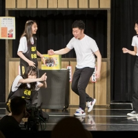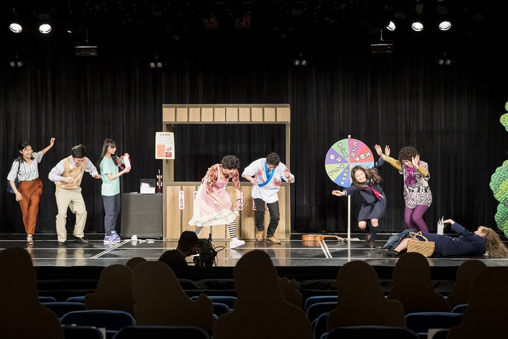 今回の即興劇はNMB48のメンバー7人と吉本新喜劇のメンバー5人の12名で構成。時間は30分で、「ビンタ」「ダンス」「泣く」「大好き」「ものボケ」「モノマネ」「恨む」「実は...」と書かれた即興ルーレット、出演者が事前に書いた「ひと言セリフ」、警察手帳などの小道具を自由に使ってOKというルール。物語の舞台は「広場の屋台」。演じる役柄は、安部が金持ちマダム、石田が婦人警官、石塚が借金取り、梅山が戦隊ヒーローのアクション女優を目指す高校生、貞野と塩月が女子高生、渋谷がダジャレばっかり言う大阪のおばちゃん。そして、アキが屋台バイトのおばちゃん、浅香が悪い芸能事務所の社長、吉田が誰かの父、清水が屋台の大将、鮫島が誰かの姉。それぞれが役の衣装に着替え終わったところでスタート。誰がどのタイミングで登場するかも重要で、登場した人のセリフによってストーリーが変わっていくので、一瞬たりとも気が抜けない状態に。ルーレットで予想外の笑いの場面が生まれ、ひと言セリフがミラクルを起こすシーンも。石塚は芝居経験も多いが、ほとんどのメンバーが舞台の経験が少ないので、初々しさや意外な一面も楽しめる30分となった。