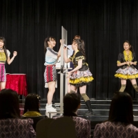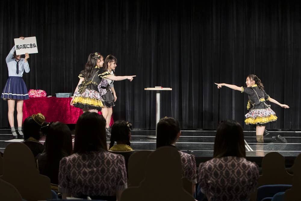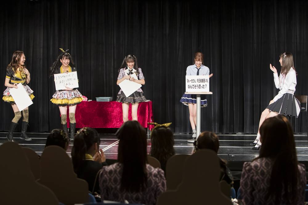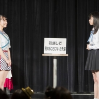 対決後は、ミニ・ライブをお届け。第1部は「OVERTURE」の後、6期生がステージに登場し、躍動感のある「ピーク」で盛り上げ、ドラフト3期生がセンター塩月で「オネストマン」を披露。そして主役のドラフト2期生は「初めての星」をセンター堀がじっくりと聴かせた。期生ごとのパフォーマンスに続いて、ドラ2の3人にドラ3の安部&塩月、6期生の貞野&新澤&原を加えた8人編成の「だってだってだって」で再びテンションを上げ、ラストは他のメンバーもペンライトを持って客席の方に現れ、全員での「ワロタピーポー」で第1部が終演。