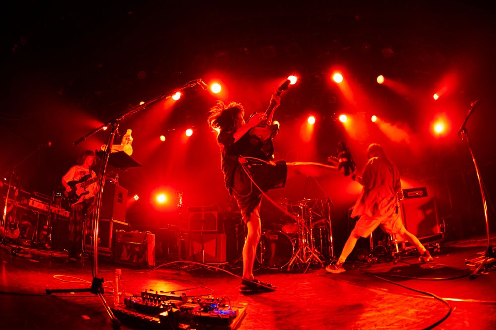 オープニングアクト2組のパフォーマンスが終わり、ステージにNEEのロゴが描かれたバックドロップが掲げられると会場からはどよめきが起こり、今夏にメジャーデビューすることが発表されたばかりのNEEの人気が伺えた。EDM/フューチャーベースを彷彿とさせるSEが流れるなか、大樹、かほ、夕日、くぅとロックバンドとして100点とも言える個性的なビジュアルのメンバーがひとりずつ登場し、会場からは歓声の代わりとなる盛大な拍手が贈られた。もはやオープニング曲として定着しつつある「ボキは最強」、縦横無尽にリズムが変化していく「万事思通」が二曲続けて演奏されると、会場の空気感はNEE一色に。そして高い人気を誇る「歩く花」、4月にデジタルリリースされたばかりの「アウトバーン」、狂気とセンチメンタルな感情が共存する「aLaLe」と、アグレッシブ且つ一筋縄ではいかない楽曲が披露されると会場のボルテージは一段階上がった。さらに「幸せか幸せじゃないかよくわからない曲をやります」とくぅによって紹介された未発表曲「こたる」では、それまでと打って変わった内省的な空間からエモーショナルに弾けていく展開で会場全体の心をつかんだ。ラストMCで「みんな革命を起こしたことある?革命なんてめったに起こらない、そんな日常のなかにいます僕たちは。そういう日常で僕たちは革命を起こしていこう!まだ革命なんて起きないですからねこの世界は」と言い残すと、YouTubeで1,000万回再生目前のスマッシュヒットアンセム「不革命前夜」で会場全体をより一層沸き立てひとつに。そして最後にNEEのパンキッシュなキラーチューン「下僕な僕チン」をなだれ込むように披露し、会場の熱気を最高潮まで高めてこの日のステージを終えた。