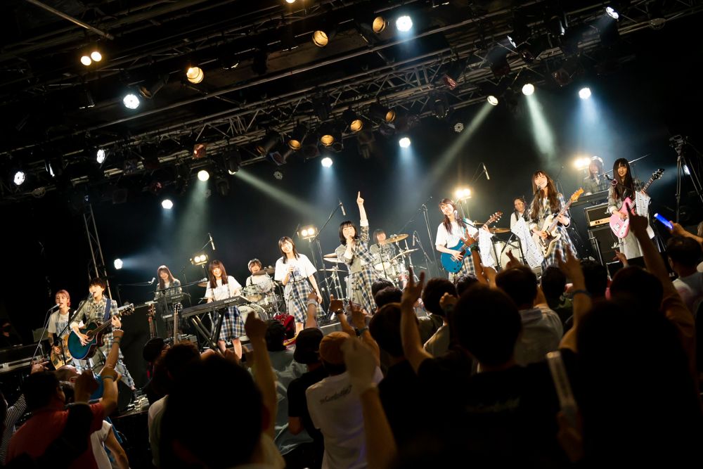 そして、キーボードの後藤理花が流麗なタッチを繰り出した卒業ソング「桜なんか嫌いだ」ではヴォーカルを務めた宇都宮が歌う<僕たちは何から卒業した?>というフレーズが、この日に限ったニュアンスで胸に響いた。しかし、ポップロックナンバー「マジでピンと」では一転して、絹本とキーボードの田村愛美鈴がダンサーとして登場し、ドラムの森ふた葉と松本も星型のタンバリンを鳴らしながらステージ上を所狭しと動き回ってフロアを大きく盛り上げた。