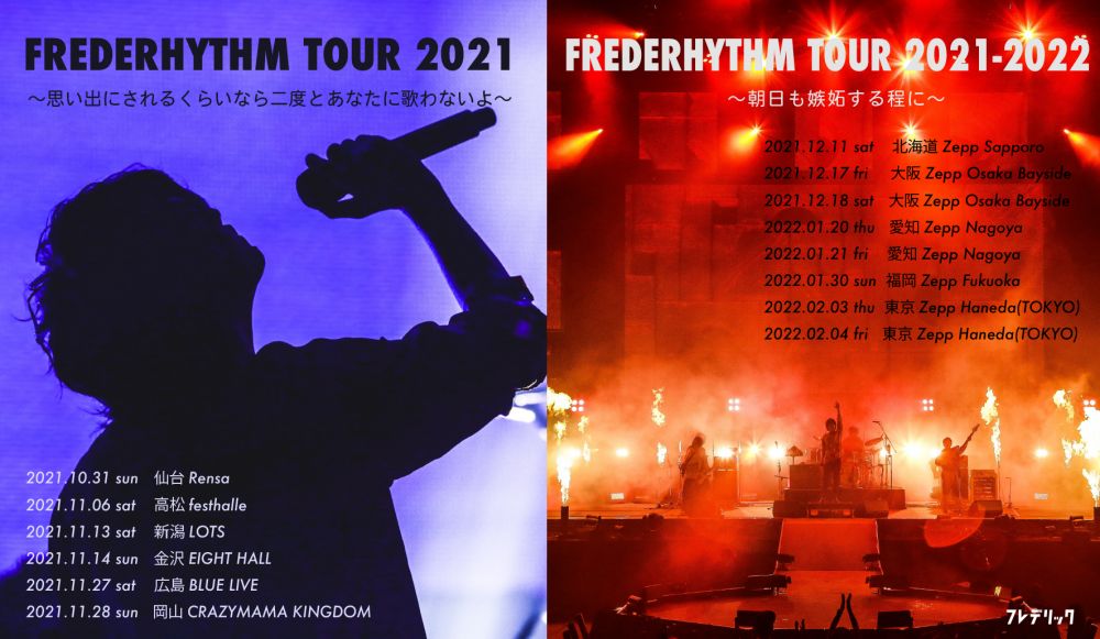 フレデリックにとって1年ぶりとなる全国ツアーで、2021年10月から2022年2月にかけて前半戦「FREDERHYTHM TOUR 2021〜思い出にされるくらいなら二度とあなたに歌わないよ〜」、後半戦「FREDERHYTHM TOUR 2021-2022〜朝日も嫉妬する程に〜」と題して開催する。オフィシャルファンクラブ・フレハウスで、チケット最速先行が6月21日(月)18:00より受付開始となる。