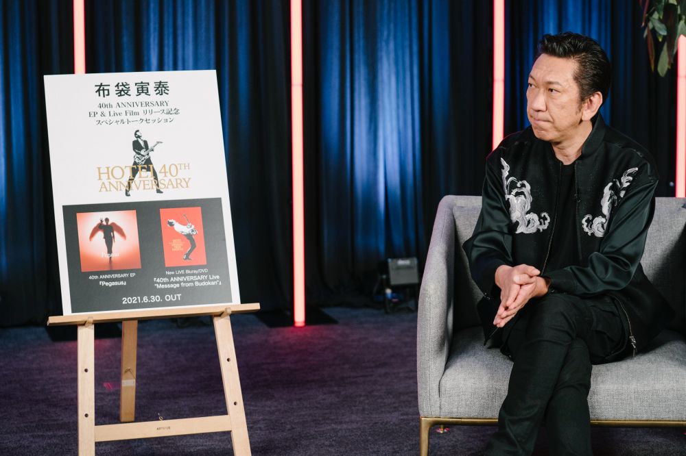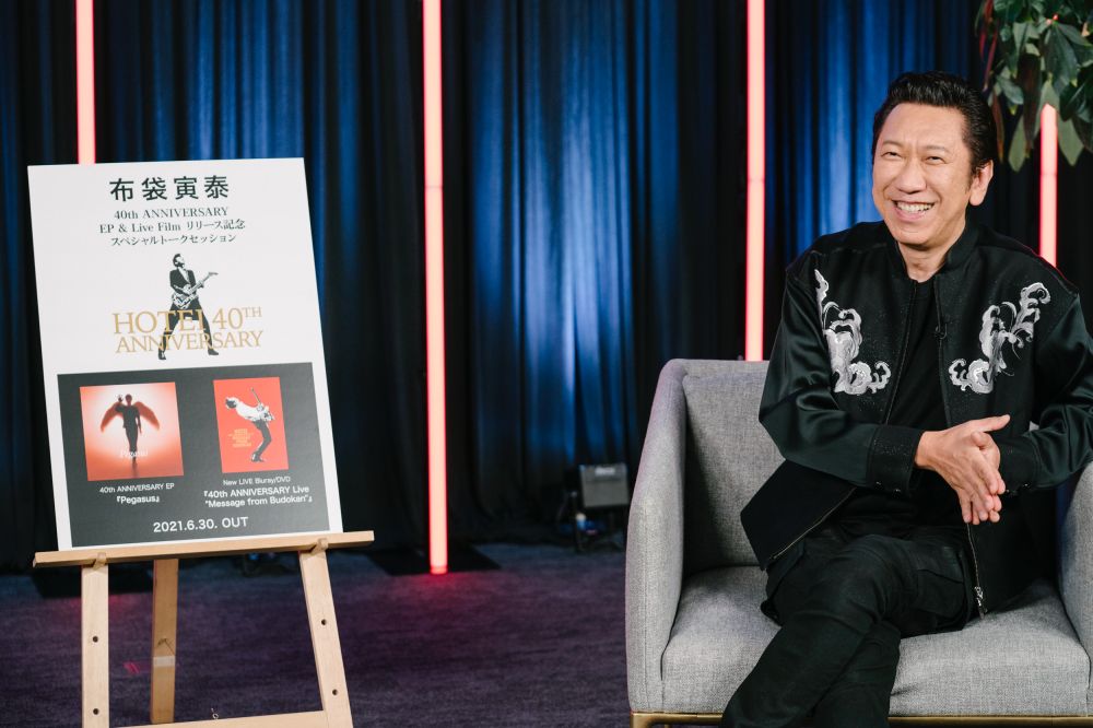 盛りだくさんのトーク内容。ラスト、MCのクリス・ペプラー氏からファンへのメッセージを求められた布袋。「みんな元気? 久しぶり。こうやって40周年を迎えることができました。迷ったときも、いつも信じてくれて。そんなみんながいてくれたからこそ今の僕がいると思っています。この気持ちは、音で返すのが僕の役割だと思っているので。まず4曲入りのEP『Pegasus』、そして無観客ではあったけどみんなの思いで埋め尽くされた日本武道館公演の映像を届けることができたので、じっくり楽しんでいただいて。この先も、こんな時代ではあるけれどスタッフと心を合わせて、この感謝の気持ちをいろんな形で伝えたいと思っています。」と熱い思いで答えた。