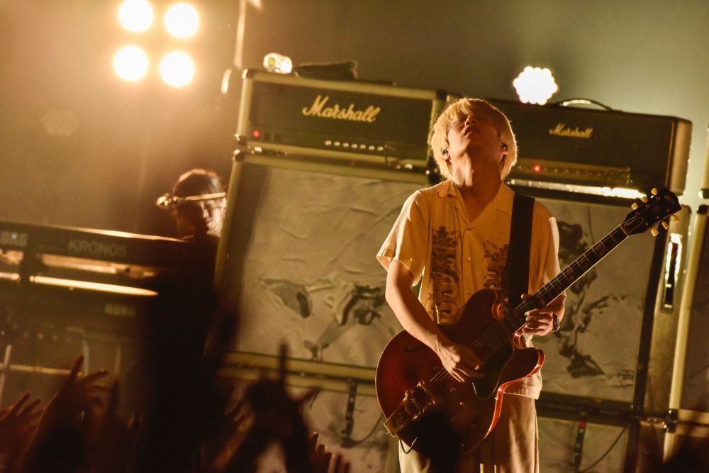 みずみずしさ、といえば負けていなかったのが白井。「今日は白井くんが歌います」と川上が促すと、なんと白井が歌いはじめたのだ……あれ、BLANKY JET CITYの「SWEET DAYS」じゃないか!? 見るとギターはグレッチ! 往年のロックファンが沸き上がる中、「You‘re So Sweet & I Love You」へするりと繋げたところも、ルーツにリスペクトと、ロックは続いていくんだというメッセージが感じられて、単なるうれしいサプライズだけにはとどまっていなかったと思う。この楽曲も含めて、ここからは、より歌詞が染み渡ってきた。オーディエンスのハンドクラップも演奏のひとつとなっていた「This Is Teenage」。溜まっている感情を解き放ってくれる演奏で、《生き抜いていけ》と歌った「Starrrrrrr」。「いつか一緒に歌おうな!」という川上の呼びかけに笑顔で応えるオーディエンスが映し出された「風になって」。「声が出せないぶん、うちらが音出すから、全部投げつけてくれ!」という言葉に説得力を感じた「Philosophy」。《君は君でしかない》そう歌いながら、川上はカメラを指した。