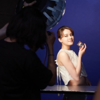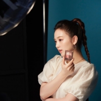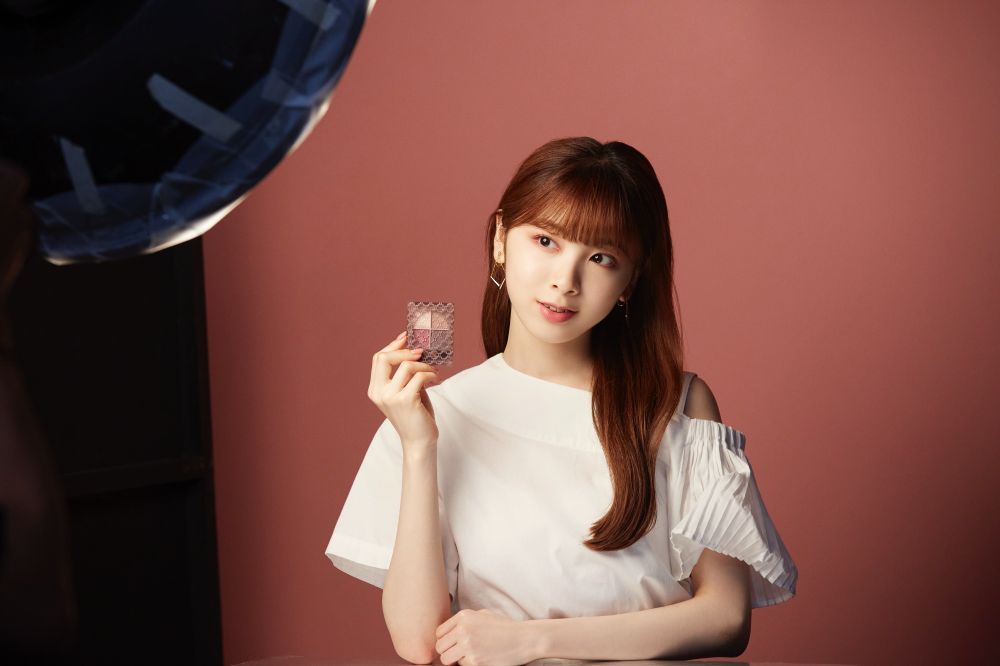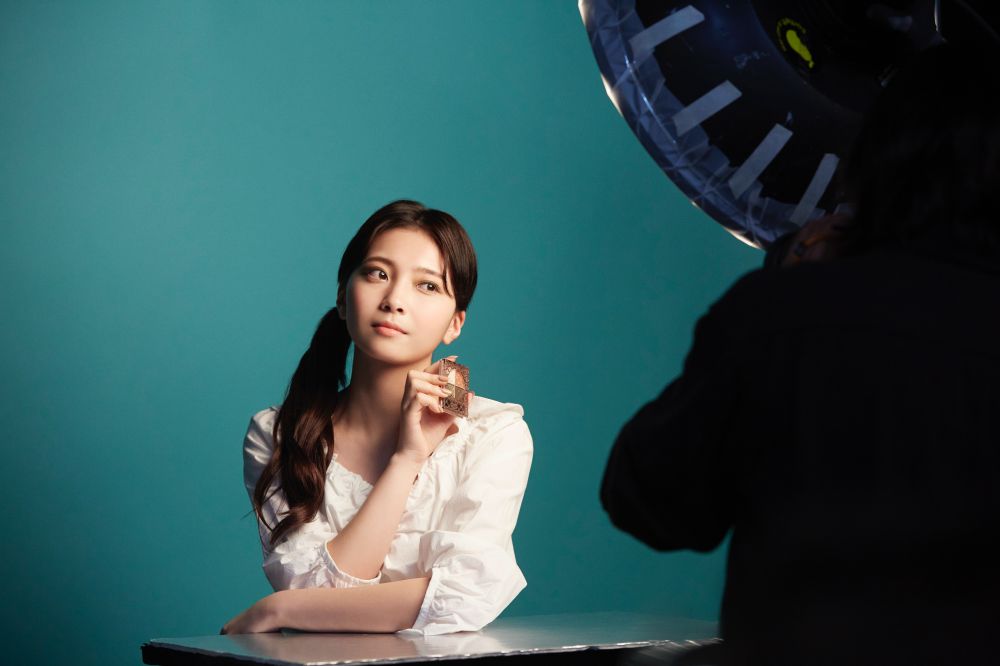 普段は穏やかな雰囲気のAYAKA。カメラの前に立つと、透き通った肌にのせられたブラウンレッドのアイカラーが目もとを際立たせ、芯の強さを感じさせる凛とした美しさで周囲を驚かせます。一方で、商品の持ち方が心配なのか念入りに確認する一面も。撮影が終わりホッとした時に見せた笑顔とのギャップにスタッフも癒されていた。