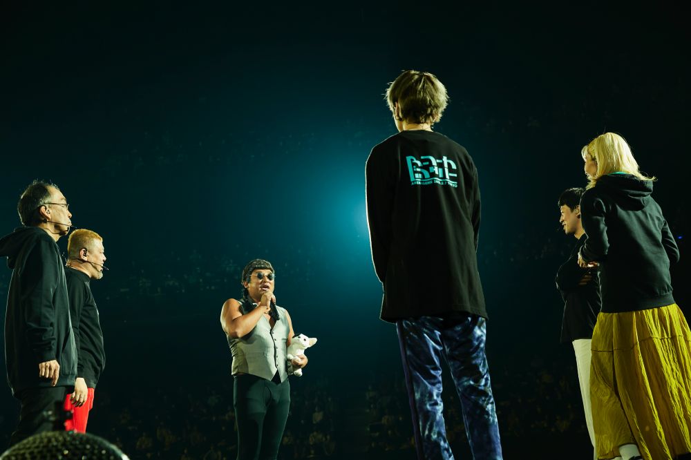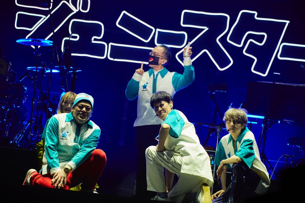 開演時刻になると、ステージには『ジェニースター』のキービジュアルとなっているコンビニのセットがLEDで表現され、お得意の自己紹介ソング“ジェニーハイのテーマ”でコンビニの制服姿のメンバーが一人ずつ登場。川谷絵音、新垣隆、くっきー!、中嶋イッキュウ、小籔千豊の順でラップをしながら花道を歩き、全員がセンターステージに集合すると、ドロップの部分ではみんなでステージをグルグルと回ってみせる。