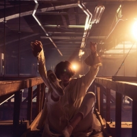 広い倉庫のような建物の屋根裏で、階下を臨み、耳をすますELAIZA。