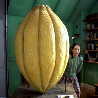 特大の「カカオポッド」の上に「チョコレート効果」をのせるシーンには何度も挑戦し、その絶妙なバランス感覚を披露。今回用意された、特大の「カカオポッド」にも興味津々。自身よりも遥かに大きい「カカオポッド」を起こすシーンは見ものだ。