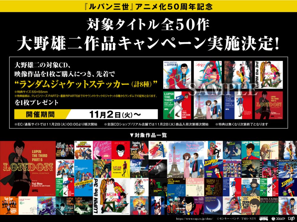 また、『ルパン三世』アニメ化50周年企画として日本テレビ系にて最新TVシリーズ 『ルパン三世 PART6』が全国30局で放送開始したのを記念して、大野雄二のCDアルバム、映像作品など<50作品>を対象とした“大野雄二作品キャンペーン”の実施が決定。