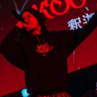 釈迦坊主は、「Hideout」「Supernova」、そして「Thanatos」へと続き、万華鏡のごときポップでめまいのするようなコラージュ感がふんだんなサウンドとラップで冒頭からダイナミックに飛ばしてく。クールに自身の世界観を作り上げながらも、MCで“久々に家を出たから…息切れが…”と肩で息をしながらはまっているゲームの話をしたりと、なかなかキャラを掴ませない。後半も“友だちを呼んできた”と言ってOKBOY&Dogwoodのふたりをゲストに呼び込み、「piro piro mo ai」で再び高揚感たっぷりに駆け抜けていった。