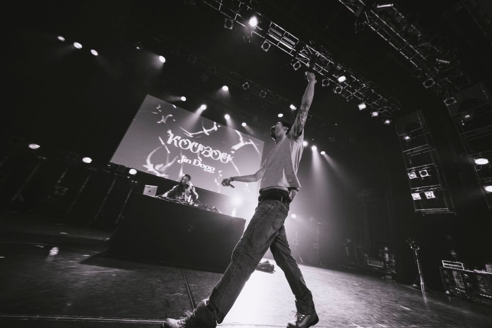 次にステージへと飛び込んできたのは、日・英・韓の言語を操る大阪・生野区出身トリリンガルラッパー、Jin Dogg。長身で、そのラップ同様に強烈な存在感を爆音で打ち鳴らすようにステージを跳ね、怒気を含んだ咆哮を響かせ、オーディエンスをアジテーションする。呆然とする者のコブシをも突き上げさせる迫力だ。拍手を送るオーディエンスに、俺のライブに拍手はいらん。恥ずかしいからとぶっきら棒ながら笑みを見せ、その分盛り上がれと煽る。コリアンタウンで生まれ育った自身のバックボーン、魂を刻みつけた「街風」にオーディエンスのボルテージが上がる。ラッパーJin Doggを生んだ、ハードな環境とそこで培った姿勢を、街の空気感もろとも伝える説得力が、この会場の空気をも震わせる。