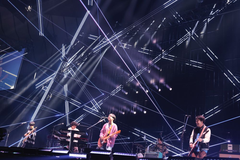 そして「バズリズムLIVE 2021」の大トリを務めるのはsumikaの4人。2018年、2019年に続いて3度目の出場だ。冒頭はSumikaのライブ恒例の登場SE『ピカソからの宅急便』が場内に鳴り渡る。オーディエンスも早速クラッピングで応じる。オープニングSEの時点でsumikaのライブは始まっているのだ。ボーカルの片岡健太からの『光栄な大トリ、張り切って始めます!』を合図に演奏がスタート。1曲めは彼らのメジャーデビュー・シングル「フィクション」を持ってきた。この曲は初めて「バズリズム02」に出演したときに演奏した思い出の曲。『あの頃(2018年)は、まだテレビ局の人たちに対して警戒感あったけど、「バズリズム02」に関わってる番組スタッフの人たちは自分たちの味方なんだなと実感しました』と当時を思い起こし『だから、今年いちばんいいライブやります!』と宣言。「ふっかつのじゅもん」「イコール」「願い」と彼らの定番ナンバーを惜しげもなく披露。