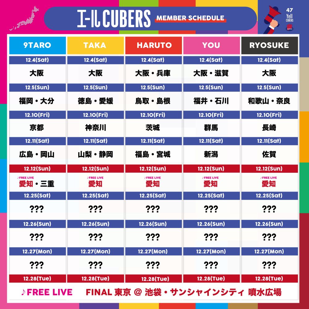 CUBERSが“47都道府県『エールCUBERS』”という新企画を12月4日から12月28日までの約1か月間、開催することが決定した。合わせて新アーティスト写真の公開と新曲「エブリデイ・アイシタイ」の制作が決定した。