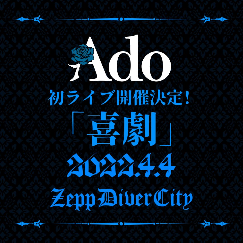 「この度、Ado初ライブの開催が決定しました。2022年4月4日にZepp DiverCityにて、ワンマンライブ「喜劇」を行います。