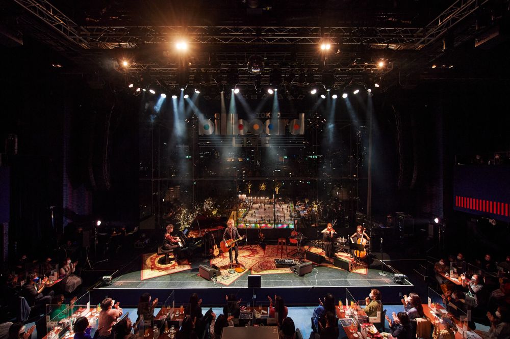 ドレスアップして出掛けるにふさわしい、ラグジュアリーな会場。4人掛けのテーブルにはアクリル板を十字型に設置するなどコロナ対策はもちろんしっかりと施されているが、会場とコラボしたオリジナルドリンクを提供するなど、音楽を楽しむムードは開演前から空間に満ちていた。客席の間を通り抜けてステージに登場したメンバーに、大きな拍手が起きる。優しいピアノの音色からスタートした1曲目は「Walk along」。ヴァイオリンとチェロのハーモニーにうっとりと聴き惚れる。椅子にラフな姿勢で腰掛け、ハートフルな歌声を響かせるINORAN。大きく身体を動かすことなくても、手をヒラヒラと空に舞わせたり胸に置いたりするジェスチャーからしっかりと心情が伝わってきた。アコースティックギターを手に取って歌い始めたのは「Beautiful Now」。「千年花」ではギターを背中に回し、スタンドからマイクをもぎ取るようなアクションも交えながら、緩急豊かに歌唱。序盤でまず再認識したのは、INORANの歌唱がロックンロール・ライヴでのそれとは根本的に異なること、音数の少なさが際立たせるメロディーラインそのものの圧倒的な美しさだった。