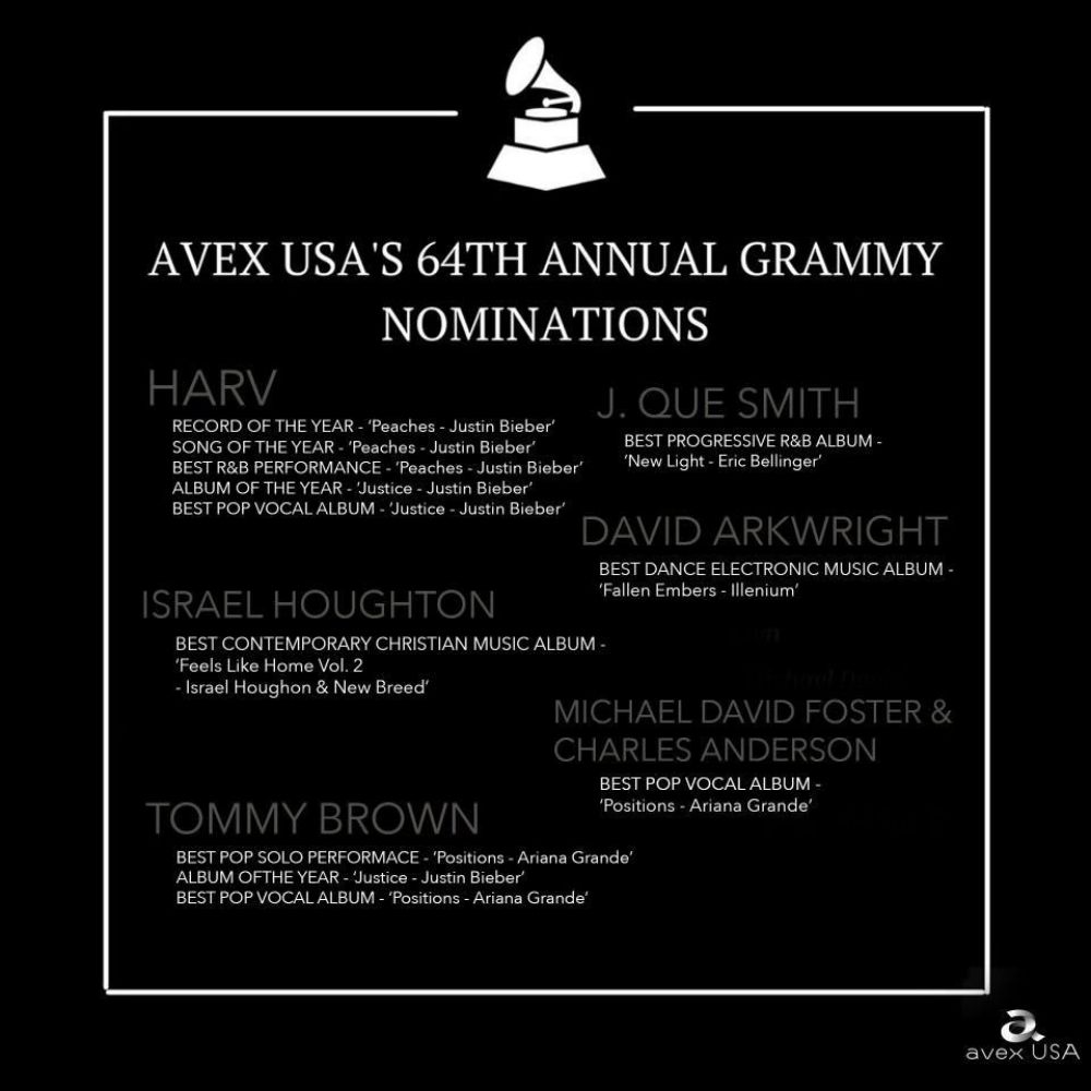 カンザスシティ出身、ロサンゼルス在住の作曲家・プロデューサーHarvが、作曲・プロデュースを行ったJustin Bieberの楽曲「Peaches ft. Daniel Caesar, Giveon」及び同曲収録のアルバム「Justice」を通して、2022年「第64回グラミー賞」の5部門においてノミネート。作曲家・プロデューサー「David Arkwright」が参加したアメリカのDJ Illenium(イレニアム)のアルバム「Fallen Embers」、作家Patrick “J. Que” Smithが参加したEric Bellingerのアルバム「New Light」がノミネートされた。