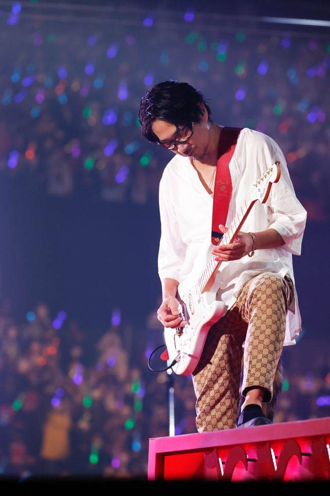 内円部が回転を止め、ステージの正面となる方位が変わって「NEO UNIVERSE」がスタート。UFOを思わせる幾つものリング状LEDがステージの外周を上下に浮遊し、曲が持つ近未来的なイメージが視覚化されていた。<あなたに巡り会えてよかった>と歌うhydeはファンに手を差し伸べるようなアクション。通奏低音であるエレクトロニックなビートは次曲「CHASE」のイントロに引き継がれて、“CALLING”という巨大な文字が警告のようにスクリーンに大写しに。花道でhydeは這うような体勢でカメラに接近しパフォーマンス。ロックンロールとエレクトロが華麗に融合したこのシングル曲リリースから早10年。1990年代、2000年代、2010年代そして2020年代とどの時代も新たなトライアルを重ね、楽曲の幅を広げ続けてきたことが伺える。