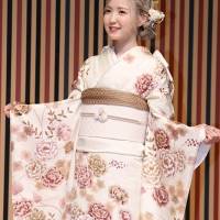 白を基調に咲き誇るように花の刺しゅうをあしらった振り袖姿。髪色と合わせたゴールドの花も印象的で、本人曰く「可愛らしい」という帯もポイント。