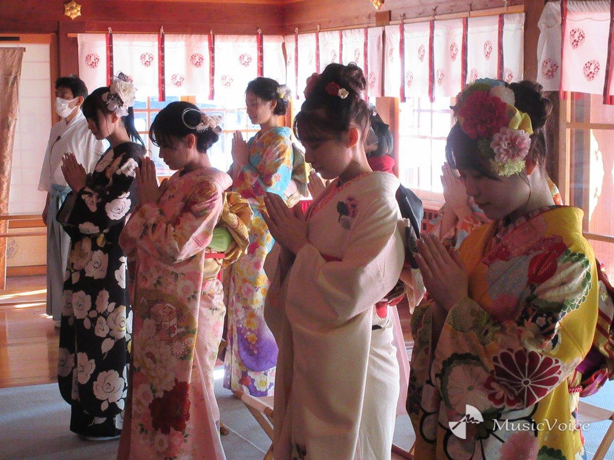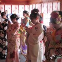 午前10時。大阪天満宮の御本殿に色とりどりの艶やかな振袖姿で登場した彼女たち。厳粛なムードが漂う中、真剣な面持ちでご祈祷を受け、破魔矢が授与された。