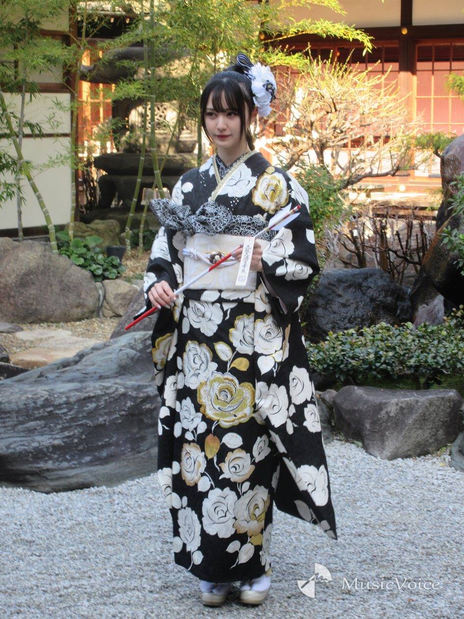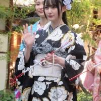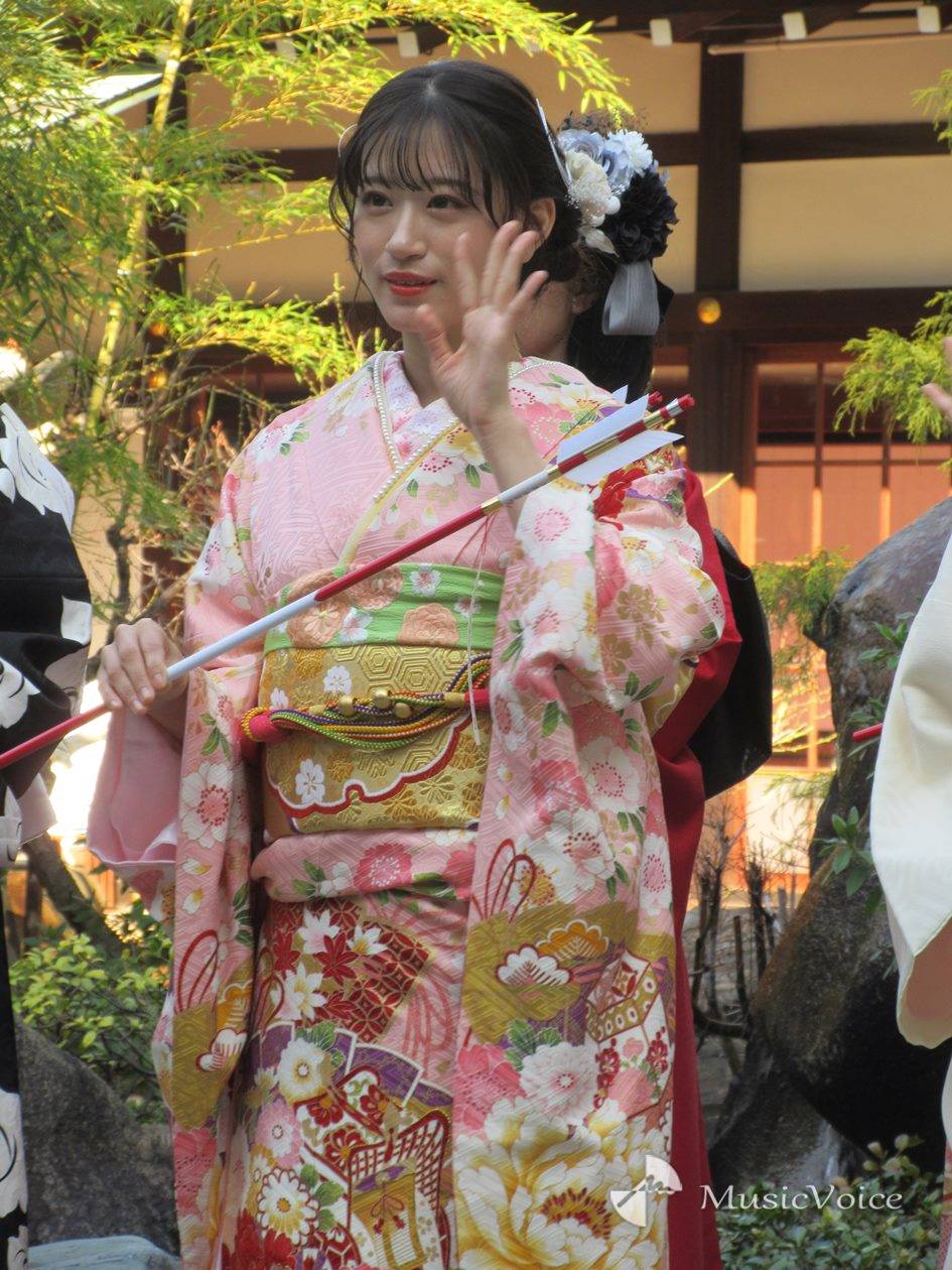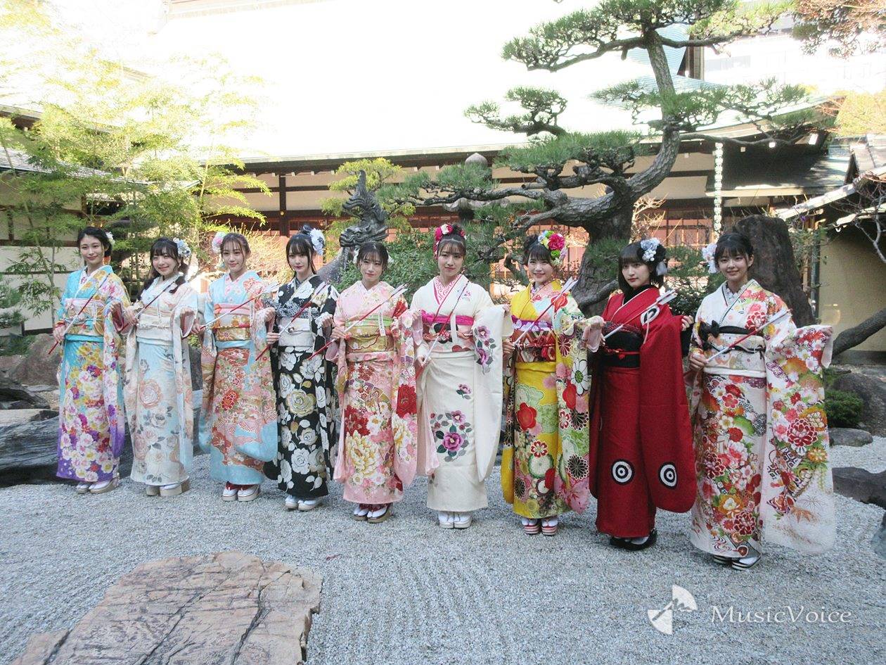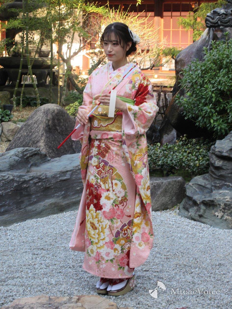 午前10時30分。中庭に移動して、まずは成人式記念撮影会がスタート。立ち位置の上手から桜田彩叶・山崎亜美瑠・出口結菜・安部若菜・上西怜・山本望叶・南羽諒・折坂心春・松野美桜の順で1人ずつ登場。1ターンして、自身の振袖をアピールする。